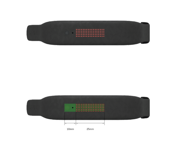 To show the time we chose a 5 x 17 LED matrix and we had to re-locate the UV ray sensor and the button, as you can see on the images. You can also see some examples of the information that will be shown, not just the time but also battery charge level, UV rays, type of activity, etcetera.